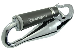 Tecnigas bietet den überarbeiteten RS als RS II auch in einer verchromten Version als echte Racinganlage mit E Homologation an. Diese Anlage darf also auf öffentlichen Straßen gefahren werden. Gedrosselt wird durch einen Trichter im Krümmer und mittels eines Durchlaßbegrenzers im Einlaß des Endschalldämpfers. Eine sehr leistungsfähige Abgasanlage mit Stärken im mittleren Drehzahlbereich, somit optimal für alle 70er Sportzylinder. Verarbeitung auf hohem Niveau, ansprechender Klang und Geräuschdämpfung auf ein akzeptables Niveau in Verbindung mit einem sehr ansprechenden optisches Erscheinungsbild, das durch den Kevlar Enddämpfer geprägt wird. Diese Anlage wird mit ABE geliefert.