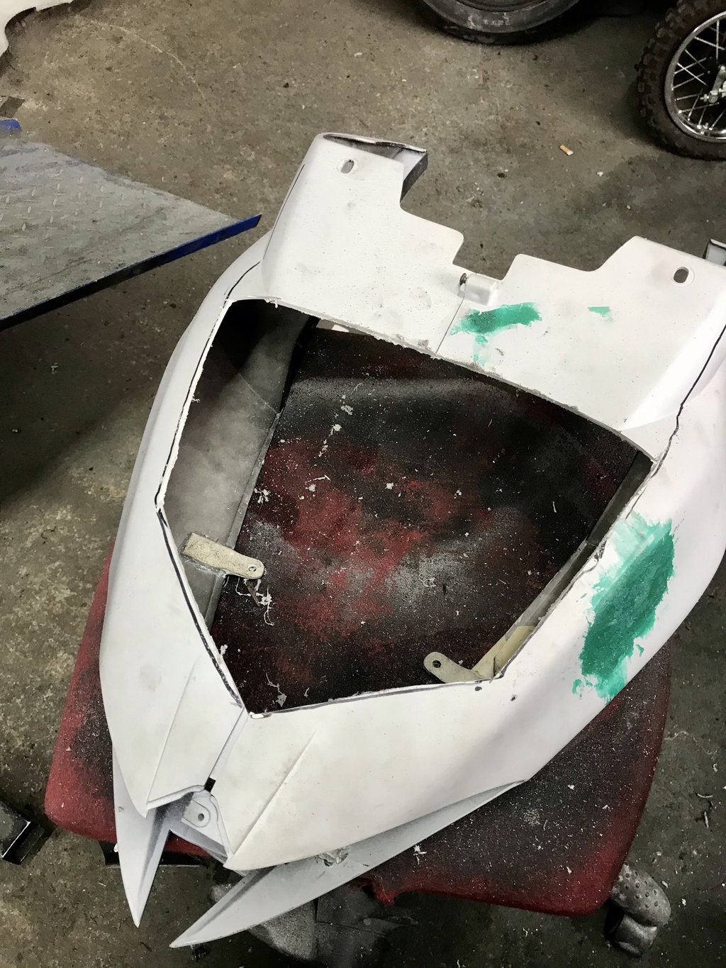 Dann habe ich sie zunächst im Bereich der Rückleucht angepasst. Danach kam der Teil hinter dem Helmfach. Das war dann schon mal schwieriger. Um später mit der Front nirgends Innen anzuliegen musste das Gitter der Front auf der Rückseite komplett geglättet werden. Auch das Batteriefach muss angepasst werden. Dann habe ich mich Stückweise runter gearbeitet bis die Front im Ausschnitt versenkt war. Auf den letzten beiden Bilder sieht man den groben Vorschnitt und die fertig angepasste Seite. Der Rest wird mit GFK und GFK Spachtel angepasst.