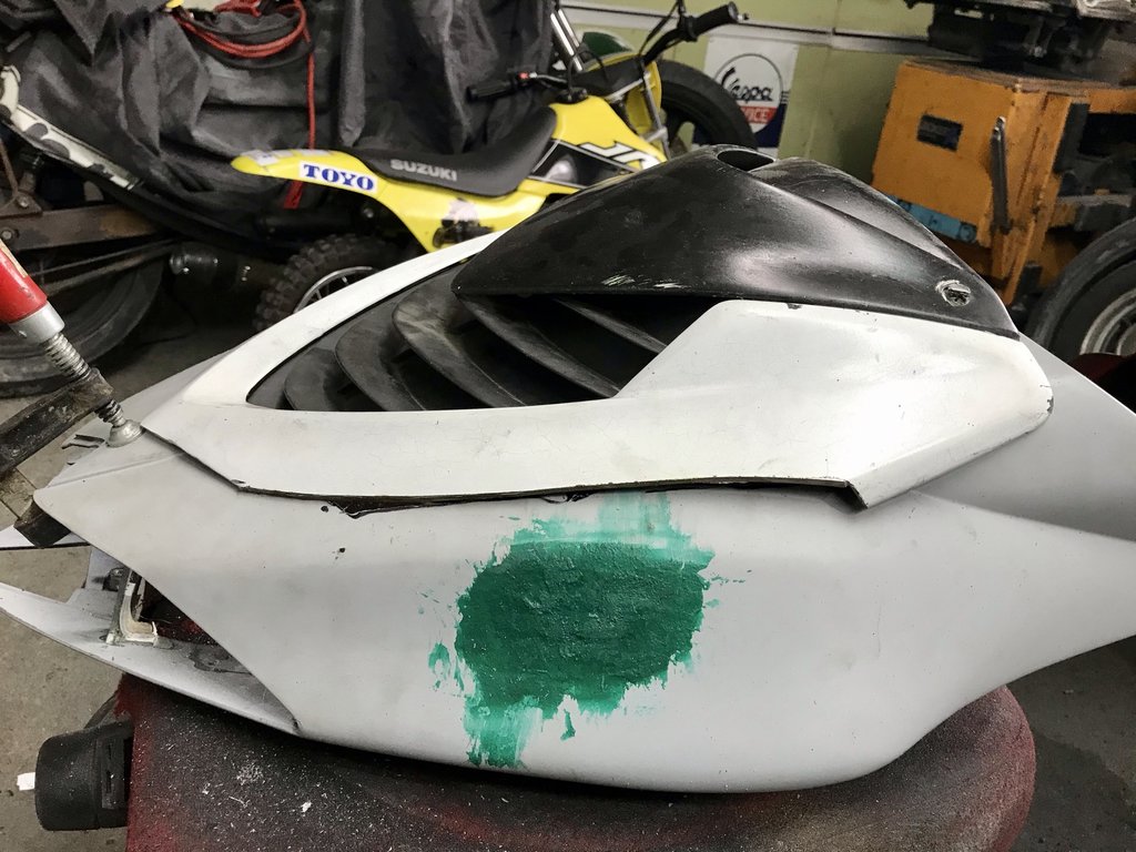 Die angesetzten Kunststoffteile dienen mir dann nur als Grundlage zum spachteln. Mit GFK Spachtel wird die Form herraus gearbeitet und zuletzt mit Feinspachtel dünn abgezogen. Wenn der Sozius fertig ist wir es noch mit einen kleinen Spaltmaß an gepasst.